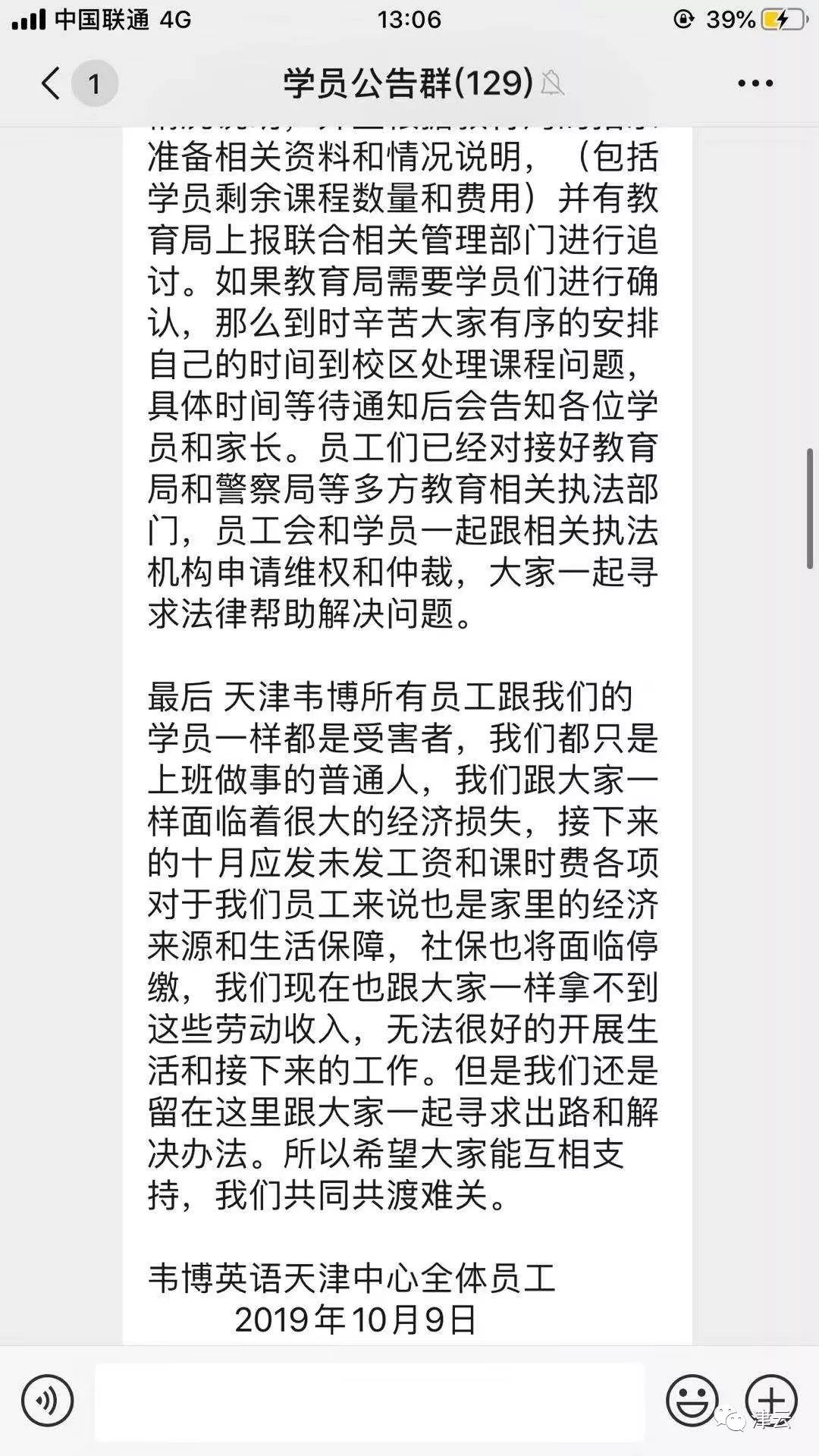 小凡(化名)是天津某高校一名大三的在校学生,10月9日一早,小凡像平日一样打开微信,准备查看自己在韦博英语的课程,却发现班主任通知:“天津校区无法正常运营”。小凡感到纳闷:“10月6日我上课时校区还一切运行正常,短短三天的时间,怎么就关闭了呢?”