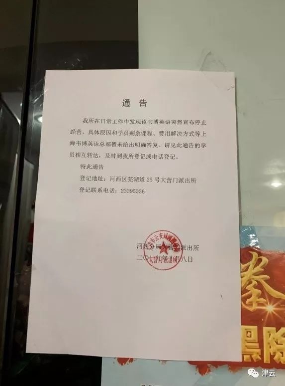 昨天下午,记者走访了韦博英语小白楼平安大厦中心门店和南开大悦城中心门店。平安大厦店已经大门紧闭,空无一人,玻璃门上贴着的通告称,学员们可到公安河西分局大营门派出所登记情况。
