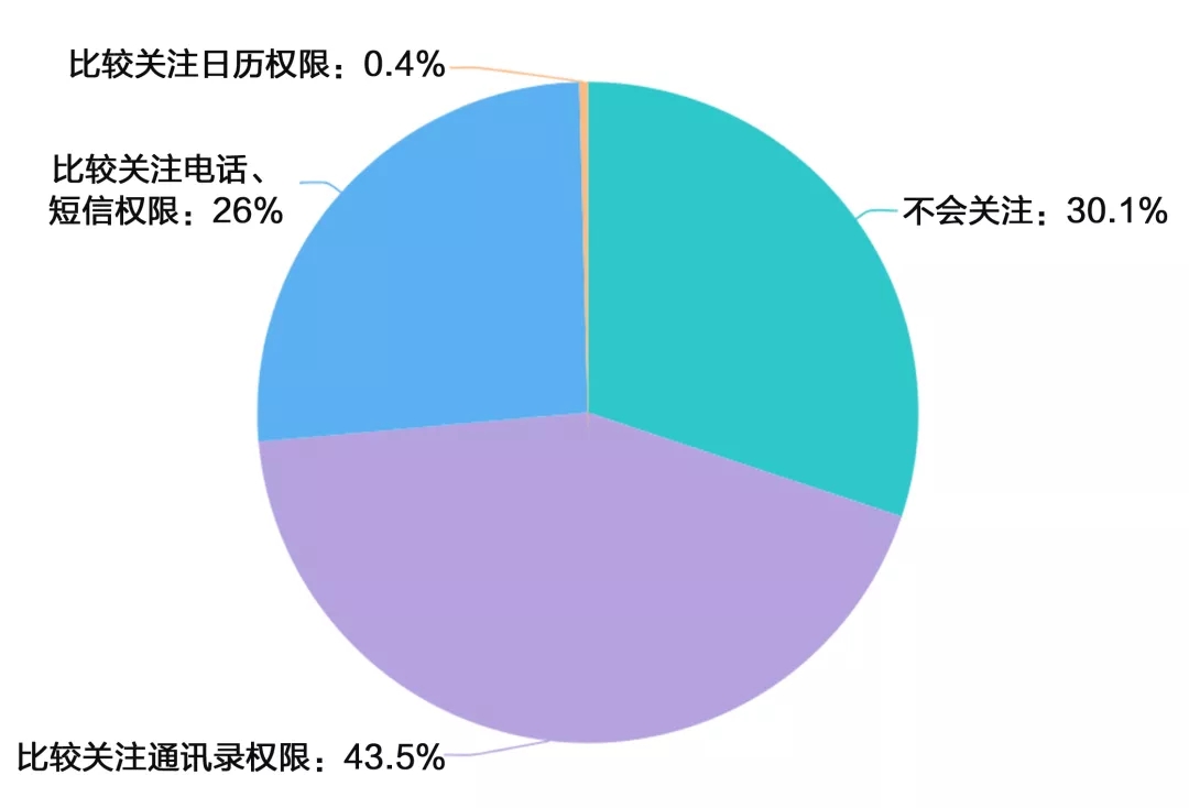 69.9%的消费者关注手机APP获取个人权限问题。其中,通讯录权限最为关注,占43.5%;26%的消费者关注电话、短信权限。值得关注的是,仅有0.4%的消费者关注日历权限。