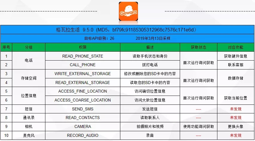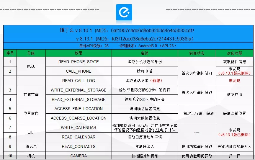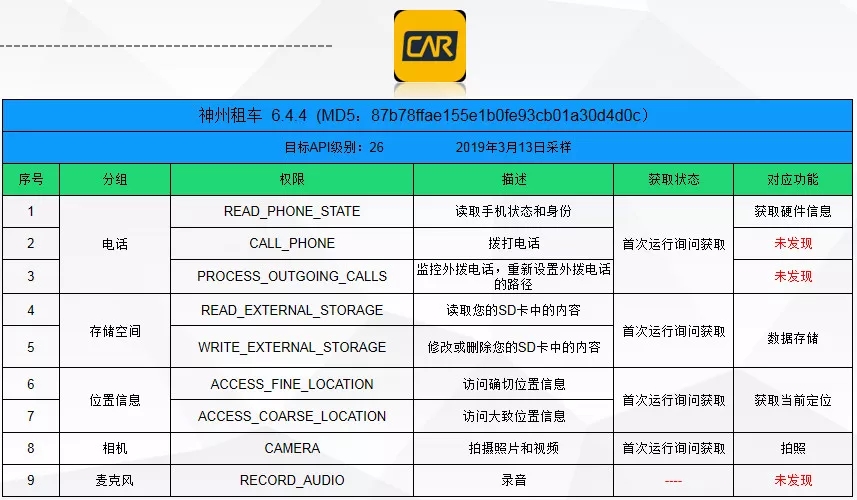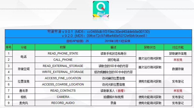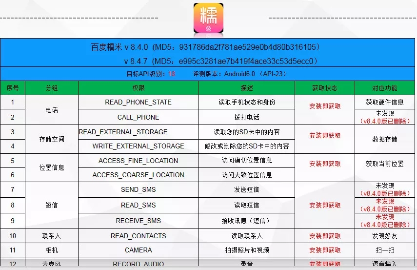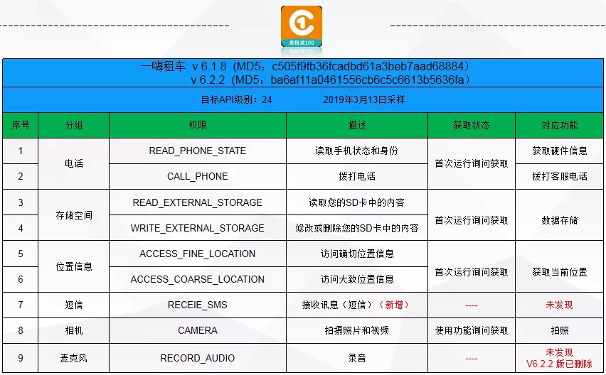 截止到3月23日,仍有9款应用未能就其权限和功能无法对应的问题进行改进。问题涉及发送短信、录音、拨打电话、读取联系人、“监控外拨电话,重新设置外拨电话的路径”、接收讯息(短信)、读取通话记录等敏感权限未找到对应功能及目标API级别低等。