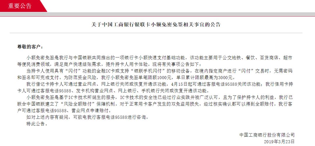 同时,工行、农行、中行、建行、交行、招行、浦发、兴业、平安、民生、中信、光大等银行持卡人可在各行手机银行APP开关借记卡/信用卡小额免密免签业务(部分银行仅支持借记卡或信用卡),后续将有更多银行提供线上开关选择。