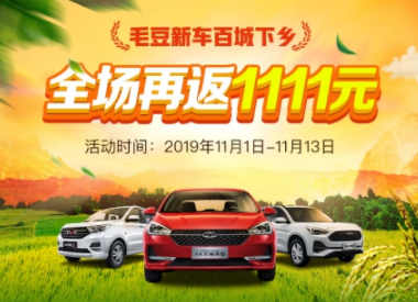 据介绍,毛豆新车此次百城下乡,将覆盖全国200多个城市,从11月1日起持续至年底。根据南充试点经验,毛豆新车将推出更多深受农村用户欢迎的品牌和车型,并分阶段推出更多样、更实用的优惠举措,尽量满足不同地区用户的多样化需求。其中,在第一阶段11月1日-13日的“双11”期间,符合条件的用户可领取1111元的下乡专享通用优惠券和价值880元的新手大礼包,还有多款专属优惠车型供用户选择,如五菱宏光、奇瑞艾瑞泽5、吉利远景X3等。