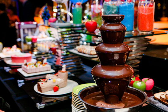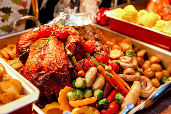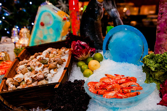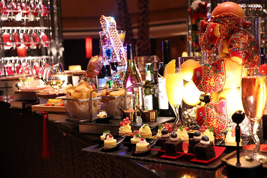 饕餮自助大餐,包含新年烤春鸡、火鸡、精选进口羊排、牛柳、鱼生日料、缤纷甜品和酒水等。