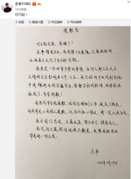 [导读] 中新网5月29日电 近日,艺人仝卓在直播中自称将往届生身份改为应届生参加高考,引发舆论关注。29日晚,其在微博发布手写道歉信,称十...