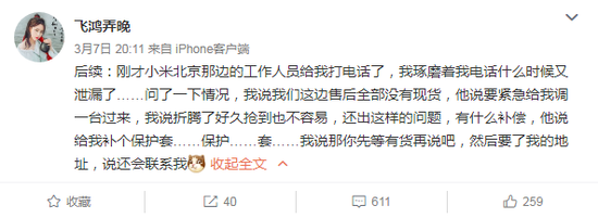 之后,小米客服也联系了该网友,@飞鸿弄晚 已在微博公布小米的处理方案:紧急调换,并补偿一个保护套。同时小米方面表示对此情况非常重视,要把这台“错版”小米9带回去研究。