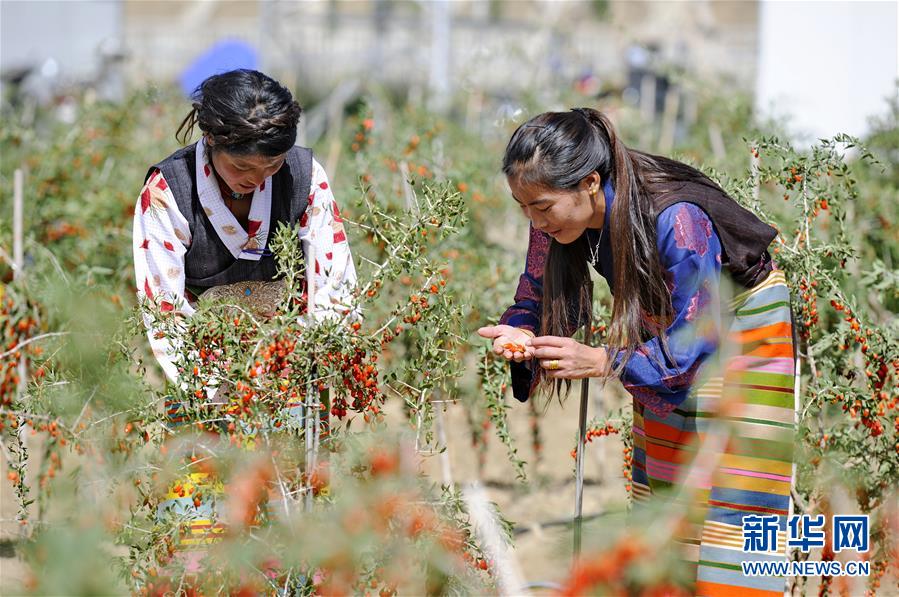 在西藏白朗县,一家生态观光产业园的员工在采摘枸杞(2018年9月5日摄)。新华社记者 张汝锋 摄