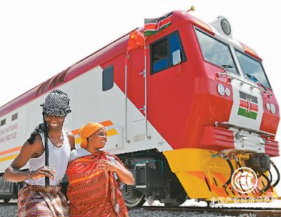 在肯尼亚蒙巴萨,当地民众在中国承制的蒙内铁路首批内燃机车旁载歌载舞。新华社记者 孙瑞博 摄