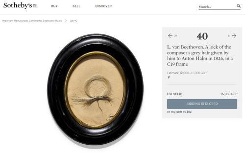而在本次拍卖前,苏富比拍卖行对贝多芬这缕头发的估价为1.2-1.5万英镑(约合10-13万元人民币)。最终的成交价3.5万英镑远高于估价。