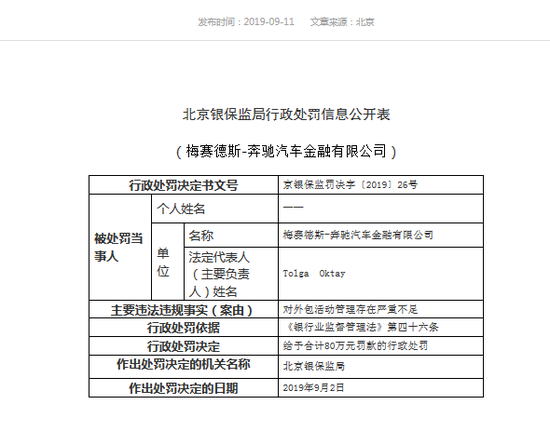 9月11日,北京银保监局公布行政处罚信息公开表显示,梅赛德斯-奔驰汽车金融有限公司因存在对外包活动管理存在严重不足的违法违规行为,被北京银保监局给予合计80万元罚款的行政处罚。