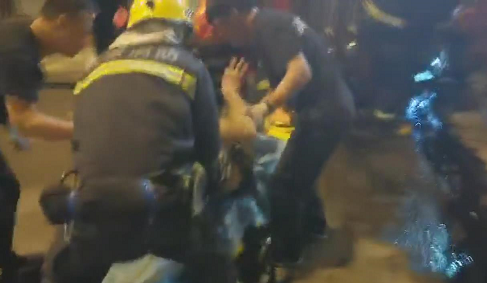 救援过程:中队到场后经询问得知,货车侧翻后,司机因手臂被压住无法活动,被困在驾驶室中。指战员立即确定救援方案,协调挖车将货车吊起,帮司机把手抽出,并协助急救人员把司机抬上担架。