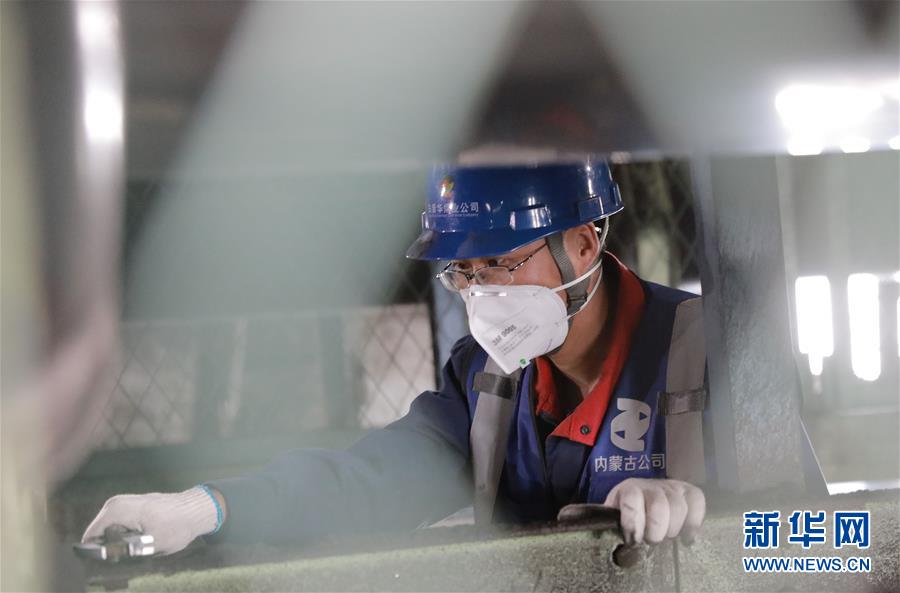9月13日,白音华煤业公司输煤皮带检修工王志强在检修皮带。 新华社记者 李云平 摄