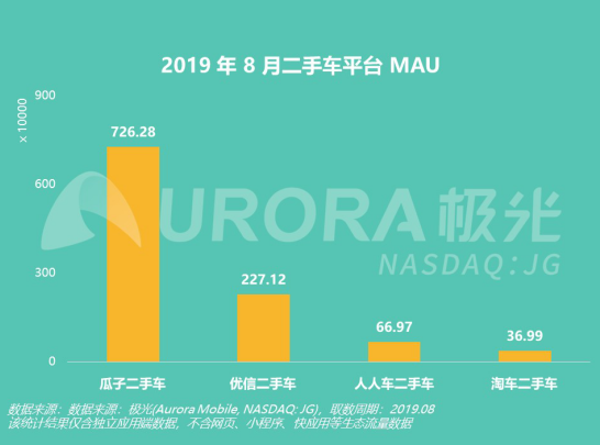 极光iAPP公布的2019年8月份汽车类APP监测数据显示,瓜子二手车APP以726.28万MAU(月活)位列榜首,是优信二手车的3.2倍,且是优信二手车、人人车二手车、淘车二手车累计之和的2.2倍。据极光持续统计数据显示,瓜子二手车APP月活用户数已连续41个月稳居行业榜首,继续保持着行业内最长连续榜首记录。