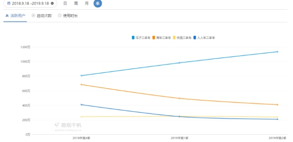(易观千帆:2018年9月至2019年9月二手车平台活跃用户数据统计)