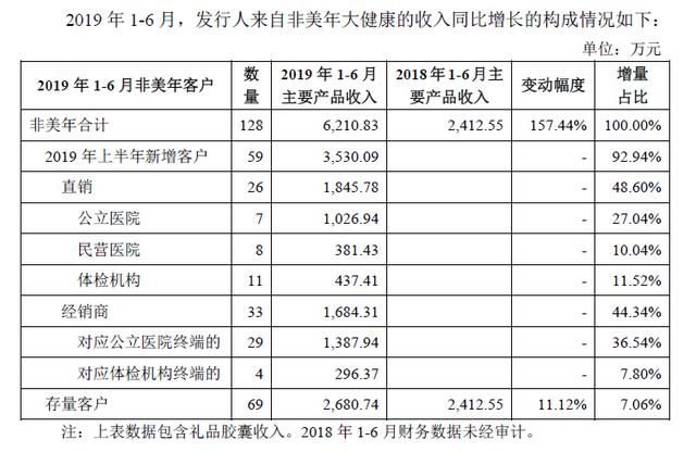 安翰科技在科创板审核问询函回复公告中称,2019年1~6月,安翰科技来自非美年大健康的收入增加3 798.28万元,同比增长157.44%,增长主要来自于新增客户的增量贡献。其中,新增公立医院直销客户贡献了增量的27.04%,新增经销商客户中对应公立医院终端的贡献了增量的36.54%。