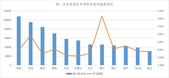 北京二手房市场价:5城区上涨,7城区下跌。报告表示,第38周,北京各区在售二手住宅市场价中,西城区二手房价格依旧最高,为107816元/平方米;其次为东城,市场价为95281元/平方米;房山均价最低,为31165元/㎡。在涨降价幅度方面,通州区市场价涨幅最高,为2.15%;石景山区域内二手房的市场价降幅最大,降幅达0.41%。