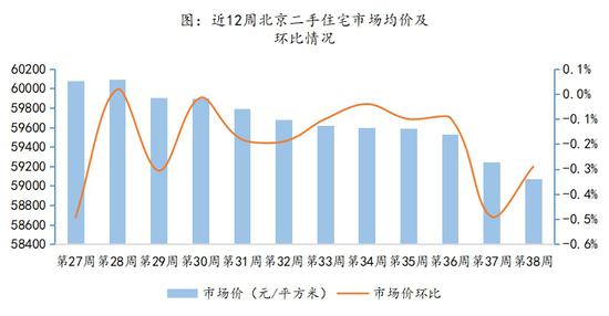 二手房市场价均价连续8周下跌。报告称,第38周,北京二手房市场价均价为59072元/平米,环比下跌0.29%,同时这也是二手住宅市场价连续8周下跌,二手房市场热度持续减退。