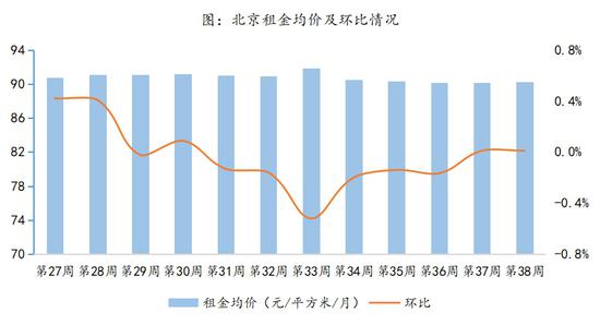 北京市租金均价保微升态势。报告称,2019年第38周,北京市租金均价为90.22元/㎡/月,环比上涨0.01%,租金均价在第37周结束持续6周的下跌后,第38周持续保持微升状态。
