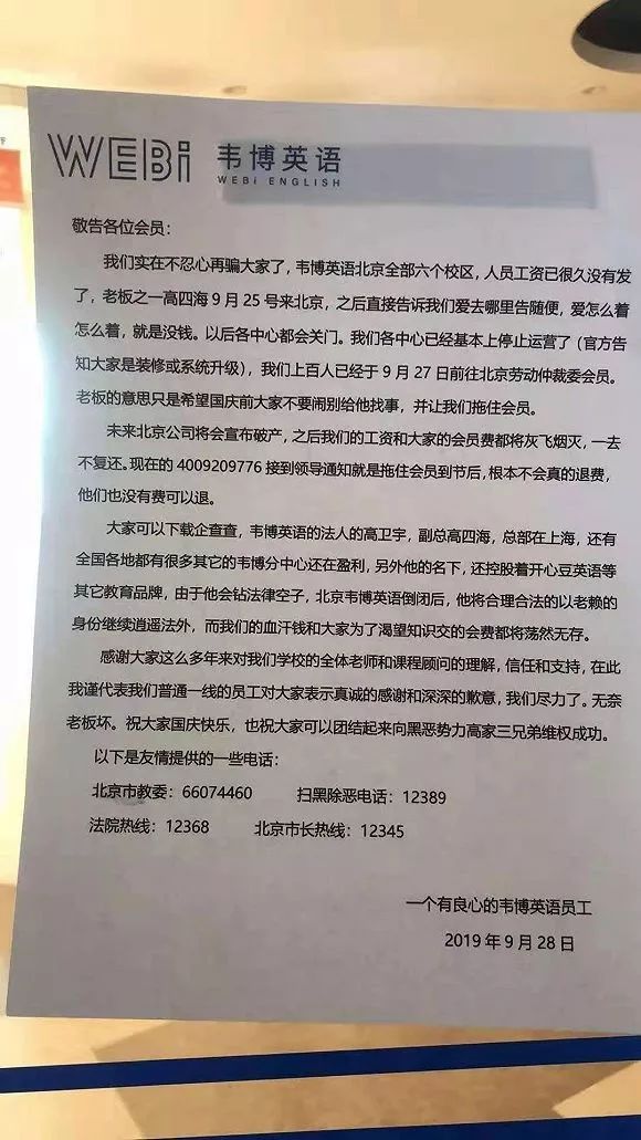 其实早在9月份开始,就不断有传出韦博英语可能倒闭的风声,北京地区员工内爆韦博发不出工资要跑路。