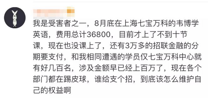 要知道,仅成都一地3个校区就有800多名学员拖欠超过2000万学费。北京地区学员数约在3000名左右,而据上海地区韦博英语在读学员自发统计,目前至少有1200名学员登记,大多数缴纳学费金额在1万-4万之间,目前统计的总金额已达4000余万元。粗略计算全国拖欠学费总规模可能高达数亿元。