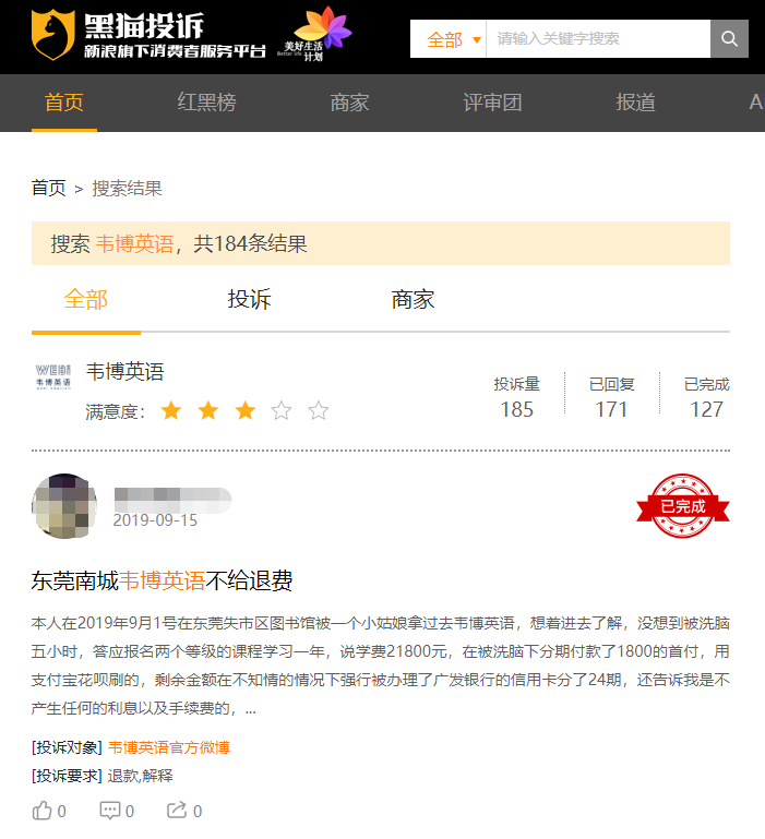 目前,在消费者服务平台“黑猫投诉上”共有185条对韦博英语的投诉,绝大多数为退费问题,投诉完成率约为68%。