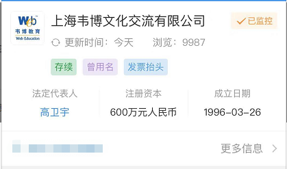 另外,上海韦博教育培训有限公司于2015年推出了产品“韦博英语”,上海韦博教育培训有限公司则由上海韦博文化交流有限公司认缴1000万元人民币100%控股。换句话说,上海韦博文化交流有限公司是韦博英语的实际资方。