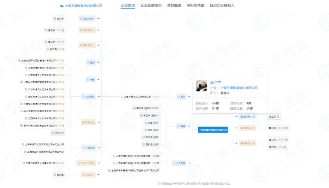 企查查显示,韦博英语创始人、韦博教育集团CEO高卫宇旗下关联92家企业。其中,高卫宇在上海韦博文化交流有限公司、上海韦博教育培训有限公司、北京韦博文化交流有限公司、成都韦博文化交流有限公司等66家企业担任法人代表。
