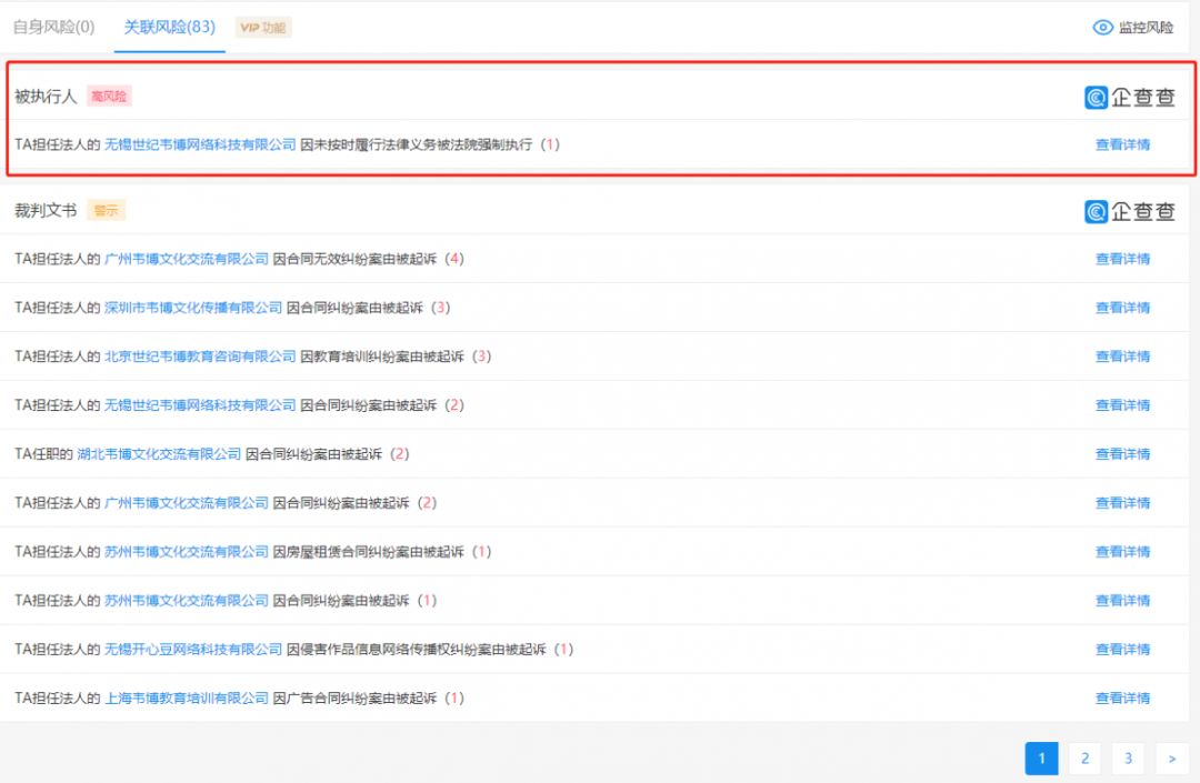 除了“培训贷”、退费难等问题外,查查君通过企查查监控功能发现,韦博英语背后投资公司存在多条风险。