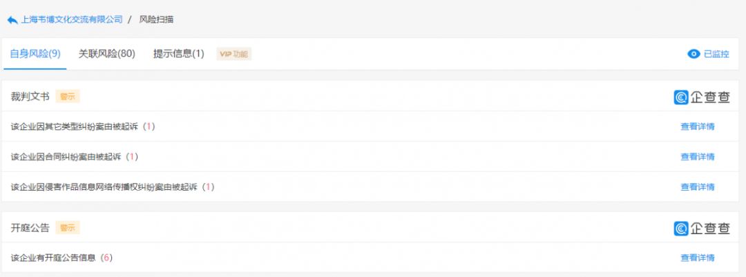 而企查查显示,成立于1996年的上海韦博文化交流有限公司有9条自身风险,80条周边风险。