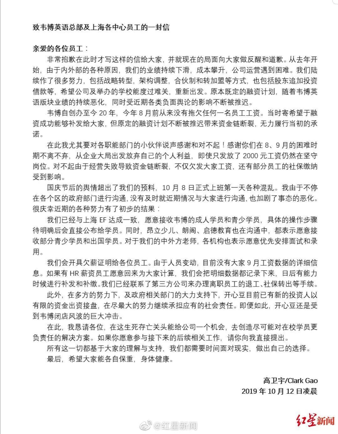 10月12日,有媒体从韦博英语学员处获知,韦博英语的创始人高卫宇于12日凌晨向韦博英语总部及上海各中心员工发出公开信。