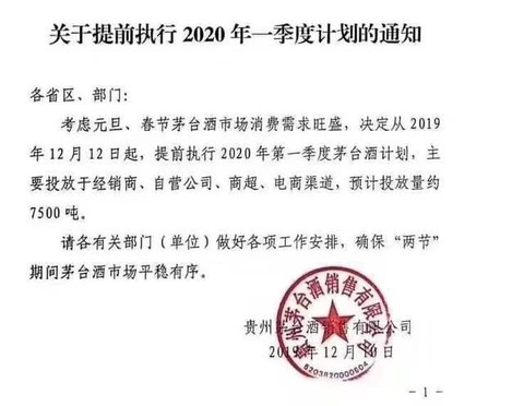 12月10日晚,贵州茅台酒销售有限公司下发《关于提前执行2020年一季度计划的通知》。