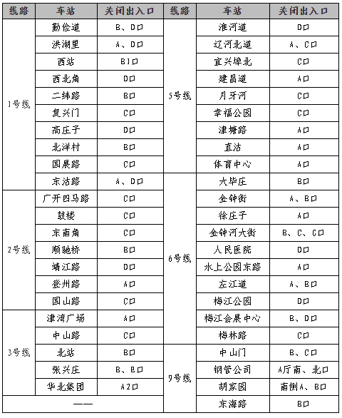 据天津广播消息,自2月3日起天津地铁将增加关闭个别出入口,车站仍正常运营,出入口开放时间根据疫情发展和客流需求情况另行确定。
