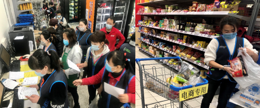 沃尔玛天津新开路店电商主管唐东红,为确保订单都能得到快速响应,她带领部门同事全身心投入到工作中,从每天的整理着装、消毒到拣货打包、接听顾客电话……每个环节都能得到妥善处理。随着订单量的激增,每天的工作餐时间变成了随机分配,日订单量最高峰时达到上千单,这段时间随着订单量增长的还有每单的件数,最多的一单竟超过100件。门店上下总动员,从管理层到主管、前台轮流到电商部支援,对于当天未配送的生鲜订单,全部放到冰柜里保存,保证商品的品质。等忙完一天的工作,收工时已是晚上11点多。“最难的时候已经过去,只要顾客满意,我们再累也值得!” 忙碌中的她微笑着说。