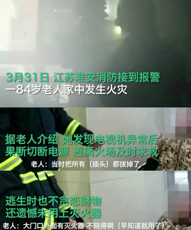 3月31日,江苏淮安消防接到报警,一位84岁独居老人家中发生火灾,老人发现电视机异常后果断切断电源,逃离火场及时求救。