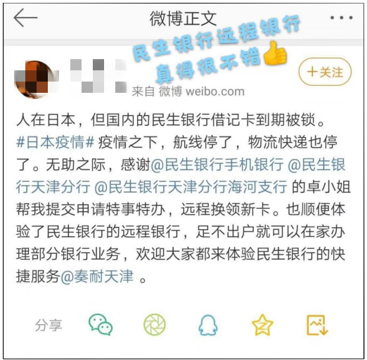 点击“远程银行”。选择“点击呼叫远程坐席”之后,黎先生通过视频“见到”了坐席服务人员。经过了解沟通,根据黎先生的困难,民生银行特事特办,通过“远程”线上流程,为黎先生顺利换领了新卡。事情得以及时解决。黎先生非常满意,第一时间在微博上为民生银行天津分行发文点赞!