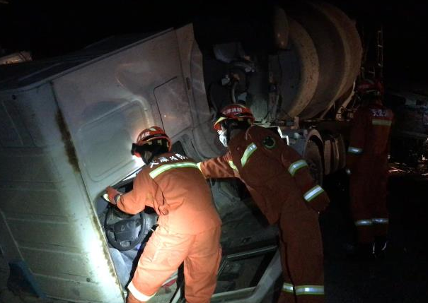 消防站到场经过观察和询问得知,一辆半挂车与一辆水泥罐车相撞,水泥罐车因碰撞发生侧翻,司机被困在驾驶室内,意识清醒。指战员立即将车门打开,扶出被困人员,待120急救人员到场后将受伤的司机送至120救护车上。随后出一支泡沫水枪对半挂车车头滴漏到路面上的防冻液、机油等液体进行清理覆盖,防止发生其他事故。消防提醒:夜晚行车密切注意路面变化,随时注意控制车速,谨慎会车,请勿疲劳驾驶。
