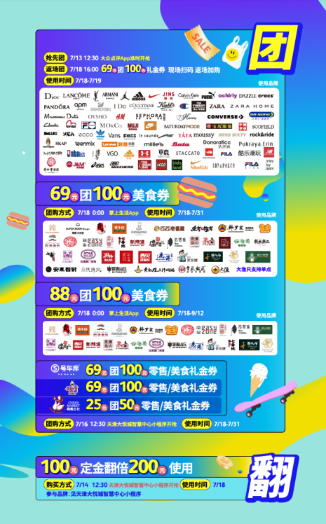 此次天津大悦城年中折扣季惠不可挡,不仅推出全城3折起的超低折扣,更有王牌满减、定金翻倍的重磅奖励活动。7月13日,大众点评率先上线79团100零售礼金券、7月18日天津大悦城现场继续接力,69团100零售礼金券返场加购;掌上生活App69团100美食券、88团100美食券,更有7月14日天津大悦城智慧中心小程序豪掷千份“百元定金”,预付成功当即翻倍,到店消费100元当200元花,超级划算的嗨购狂欢提前“预定”!