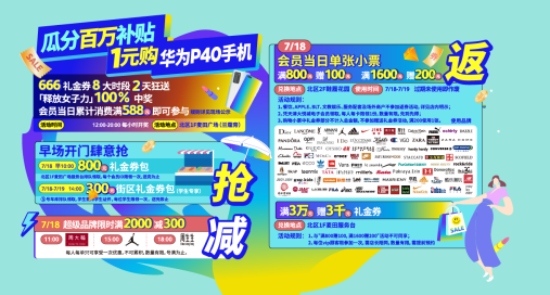 7月18日,开门礼享不停,10点准时推出800元礼金券包。届时全城消费满800赠100,满1600赠200,满3万嗨送3000礼金券,每天逢11点、15点、18点限时王牌满减,周大福、Air Jordan、周生生满2000减300,狂欢开燥!购物满588元还可参与“释放女子力”的游戏比拼,大力出奇迹,实力赢福利,百分百中奖!整点排行榜第一名豪取666元现金券,前2-10名也能喜提100元代金券,全天大排行的第一名独享1元购华为最新款P40手机的特权,惊天特价“机”不可失!