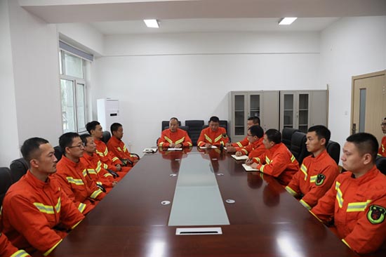 在集结点,李连忠副总队长第一时间组织增援队全体干部召开专题会议,传达了9月9日部局前指视频调度会议精神和张福好总队长的指示要求,围绕灾情研判、作业任务、队伍管理、作战纪律、安全管控、战时宣传、后勤保障等6个方面细化了落实措施,并组织对《跨区域作战安全行动手册》进行了学习。