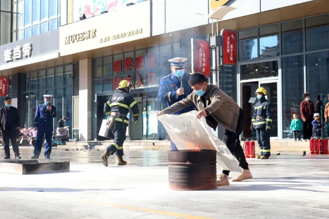 此次消防安全宣传活动分为消防灭火演练、消防业务技能展示、普及消防知识三个部分。