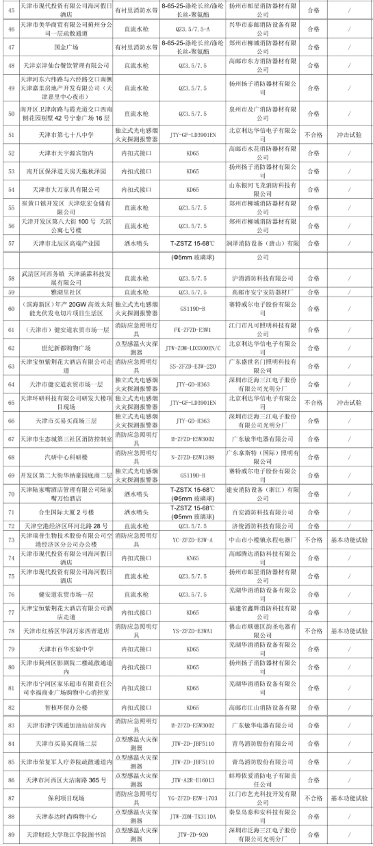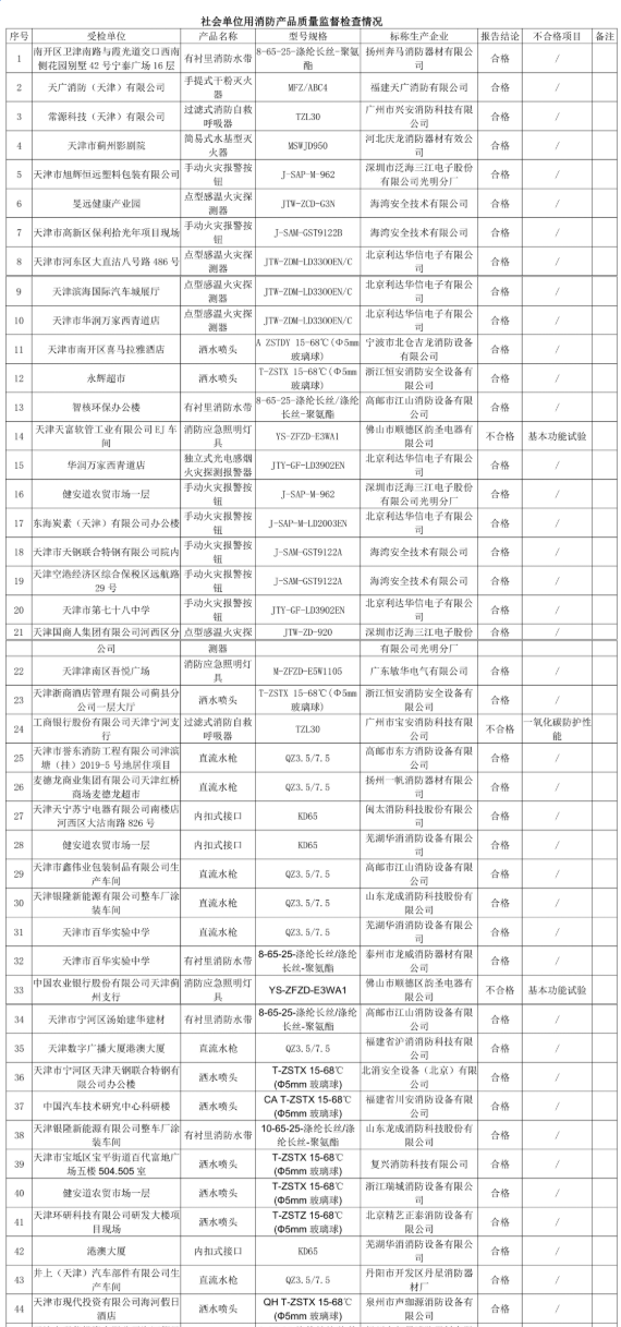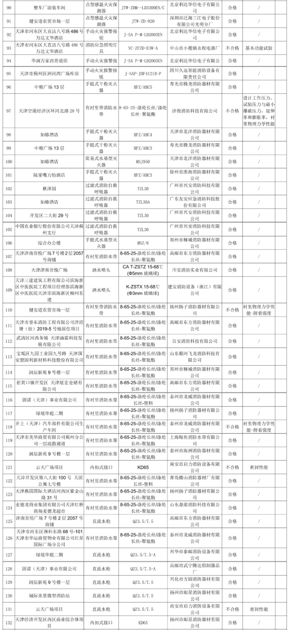 按照应急管理部消防救援局统一部署,天津市消防救援总队开展了2020年度天津市使用领域消防产品质量抽查,现将首批抽查结果公布如下: