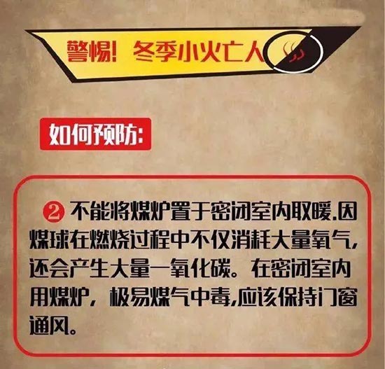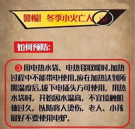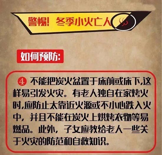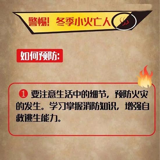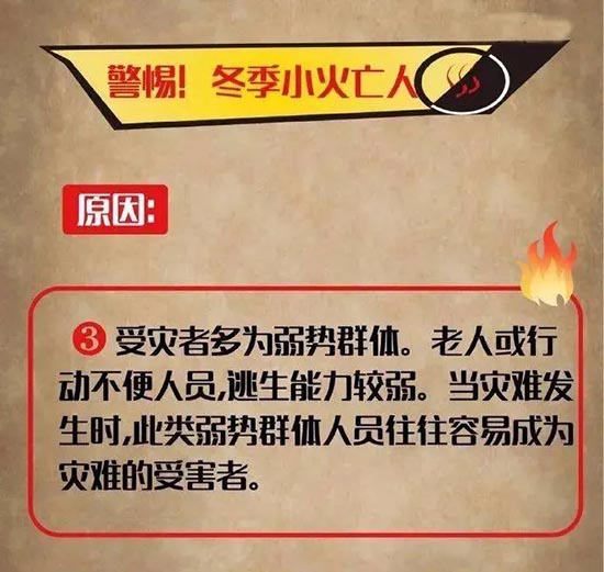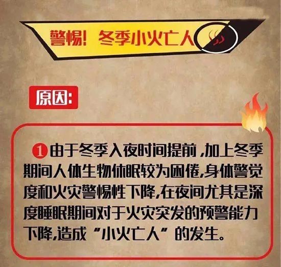 天津消防温馨提示:冬季是火灾的高发期,要注意家中的用火、用电、用气安全,严禁卧床吸烟,要做好老年人等弱势群体的看护工作,坚决杜绝“小火亡人”火灾事故的发生。