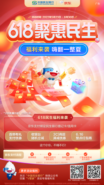 即日起至6月30日活动期间,在京东APP直接搜索“民生618”,或者从商超、3C会场的活动页进入即可参加活动。民生银行借记卡、民生银行信用卡客户,均有机会通过领取支付券、收银台直接立减、红包雨等多种方式,享受专属福利,畅享618购物狂欢。