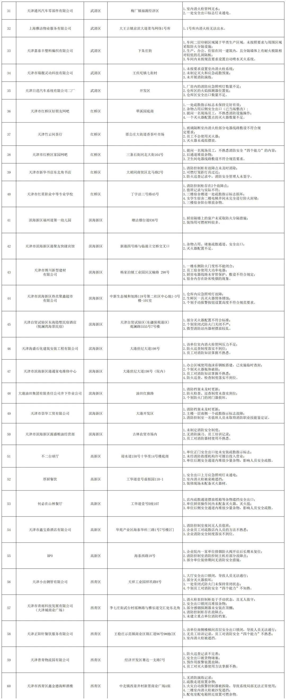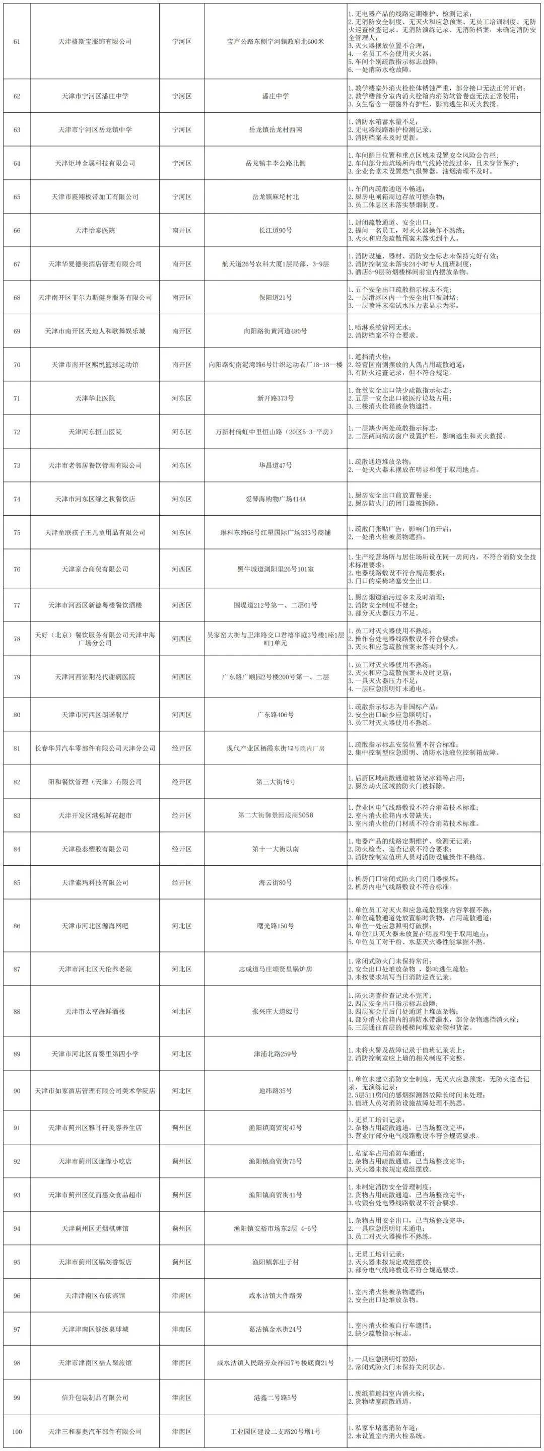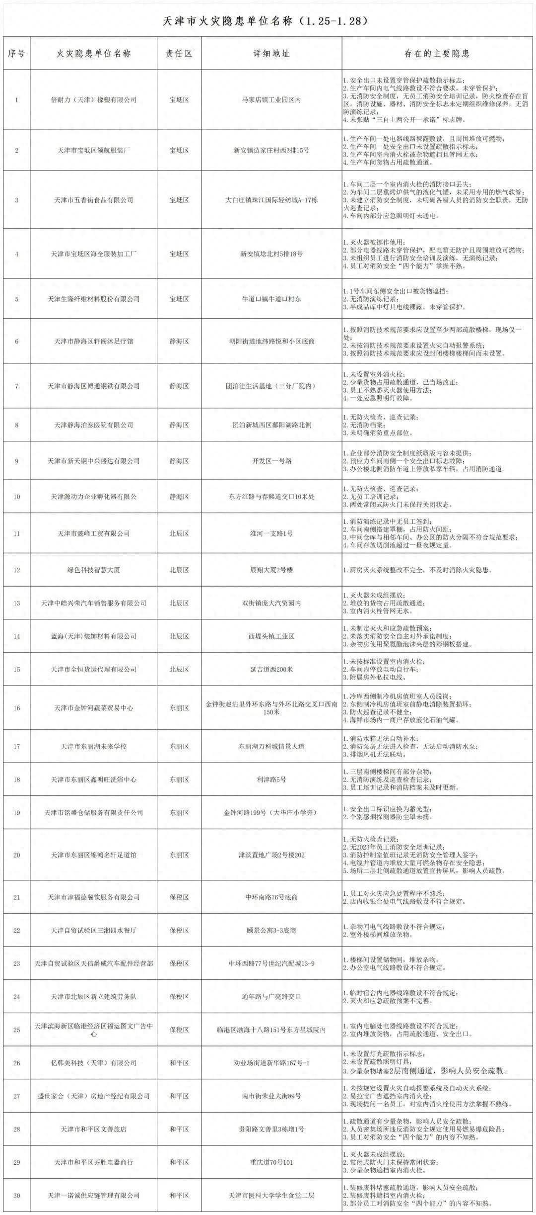 为进一步净化消防安全环境,充分发挥媒体和社会监督舆论作用,促进火灾隐患的整改,现曝光100家火灾隐患单位(火灾隐患为2024年1月25日至1月28日单位)。单位名称如下: