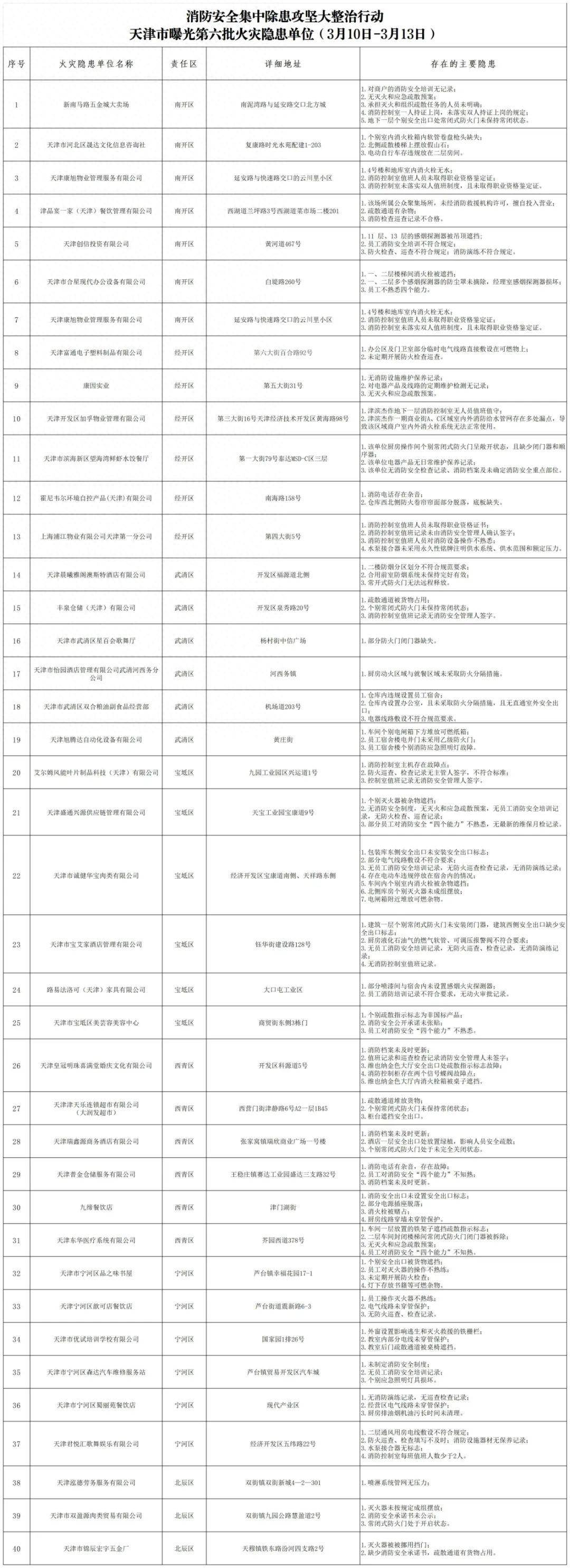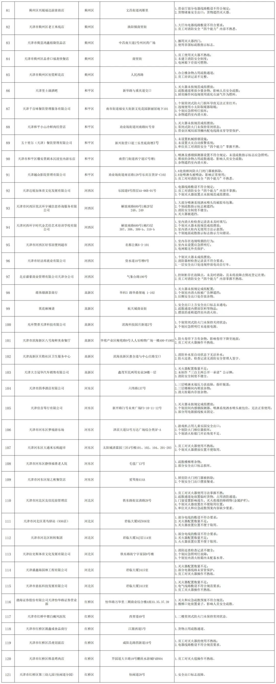 为进一步净化消防安全环境,充分发挥媒体和社会舆论监督作用,促进火灾隐患的整改,现曝光第六批121家火灾隐患单位(火灾隐患为2024年3月10日至3月13日)。单位名称如下:
