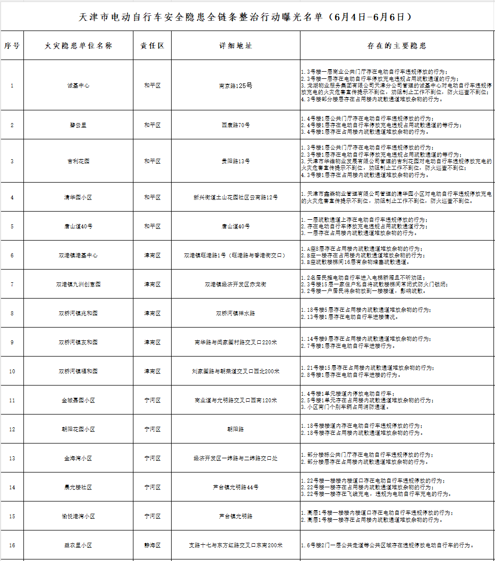 天津市电动自行车安全隐患全链条整治行动曝光名单(6月4日-6月6日)