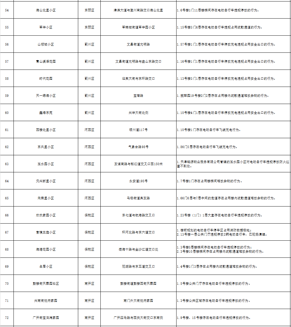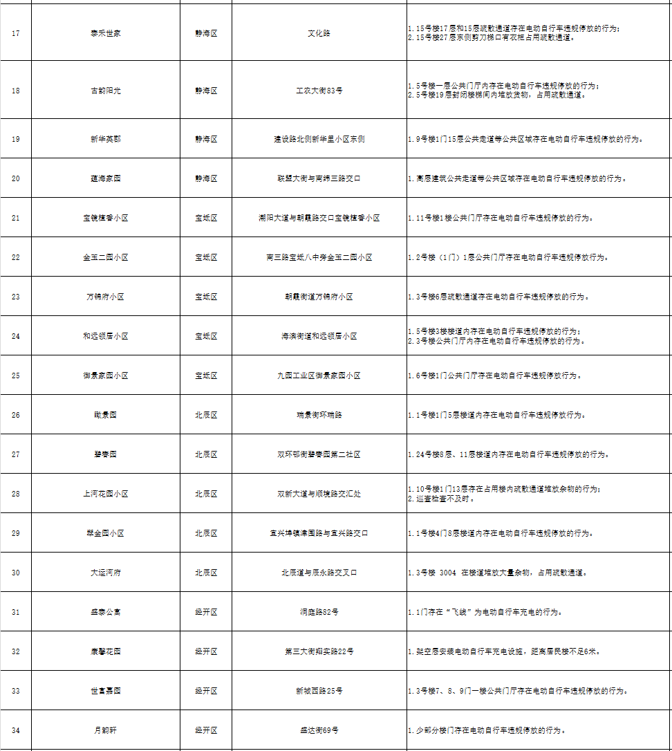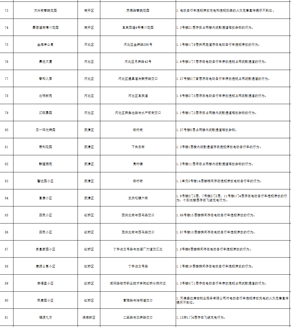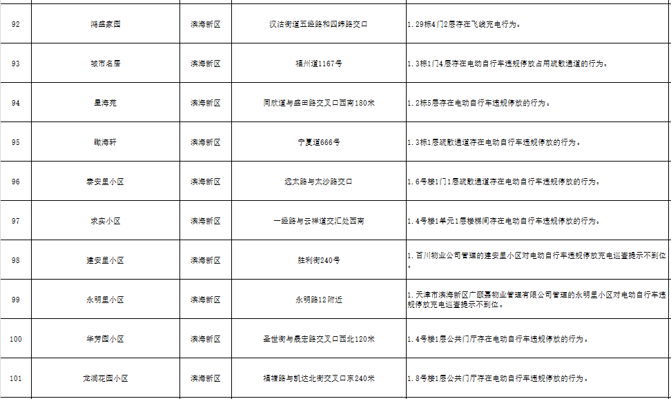 为进一步加强电动自行车安全隐患全链条整治工作,充分发挥媒体和社会舆论监督作用,现曝光101个居民住宅小区消防安全隐患和存在的违法违规行为(2024年6月4日至6月6日),名单如下: