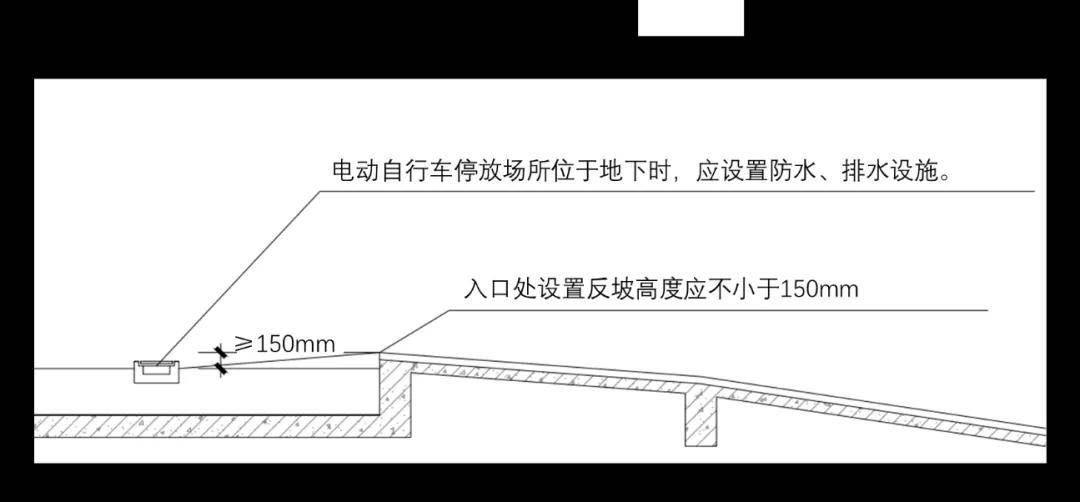 (五)电动自行车停放场位于地下时,应设置防水、排水设施,入口处设置反坡高度不应小于150mm