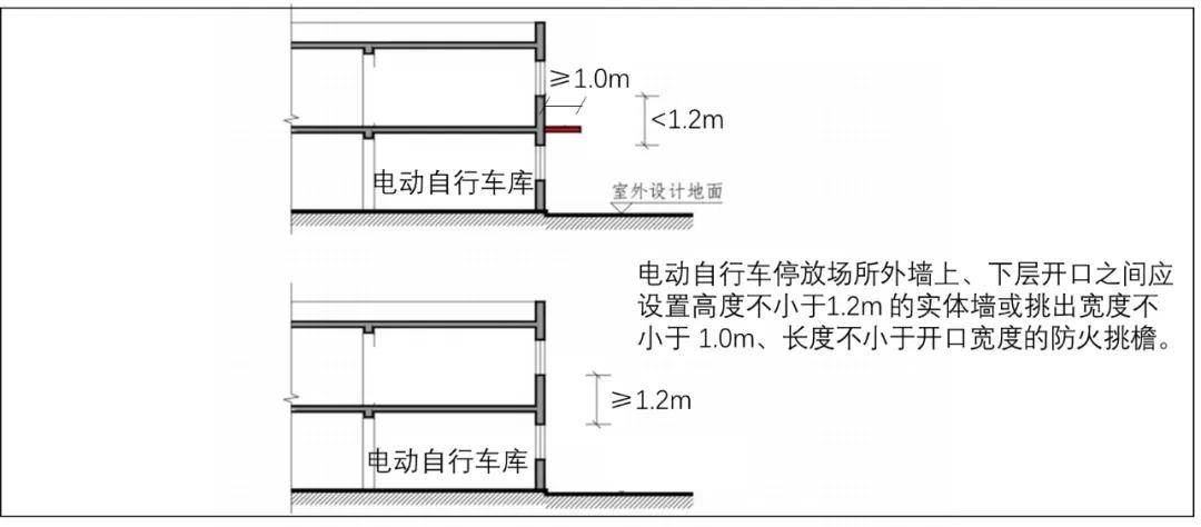 (八)电动自行车停放场所外墙上、下层开口之间应设置高度不小于1.2m的实体墙或挑出宽度不小于1.0m、长度不小于开口宽度的防火挑檐。