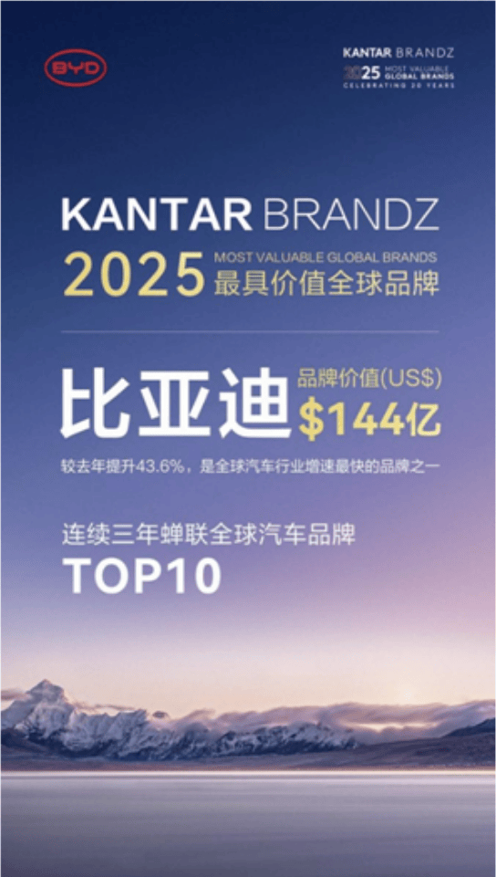 2025年5月15日,国际权威品牌评估机构凯度(Kantar)发布《2025凯度BrandZ最具价值全球品牌》榜单,比亚迪连续三年蝉联全球汽车品牌前十,且以144亿美元的品牌价值强势冲入榜单第六名,品牌价值同比飙升43.6%,成为全球汽车行业增速最快的品牌之一!这一里程碑不仅刷新了中国汽车品牌的历史高度,更彰显了比亚迪在全球新能源赛道上的领跑实力。