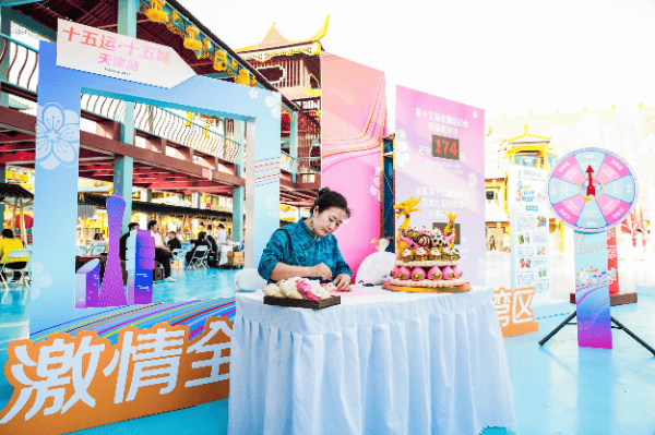 活动以“津粤方言燃动十五运·智趣闯关”为主线,特设15个主题打卡点。参与者转动方言大转盘,用津粤双语喊出“十五运,津粤并肩”等应援口号,并拍摄十五运会和残特奥会吉祥物“喜洋洋”“乐融融”短视频发布社交平台。现场更设全运知识竞答区,15道趣味问答配合吉祥物合影吸引市民踊跃参与。天津快板演员即兴表演与花式面点师制作全运主题面塑,将民俗文化与体育精神完美融合。